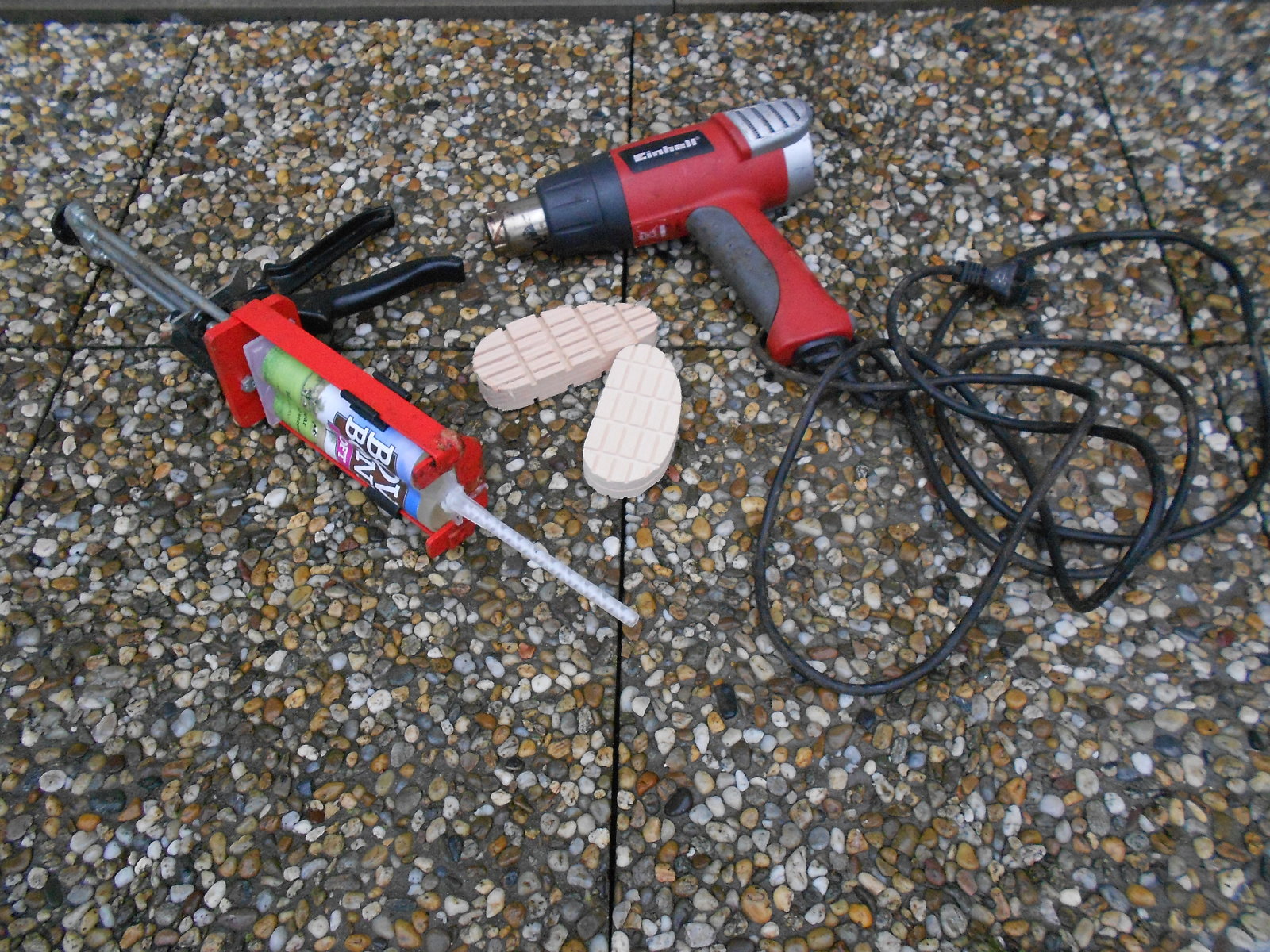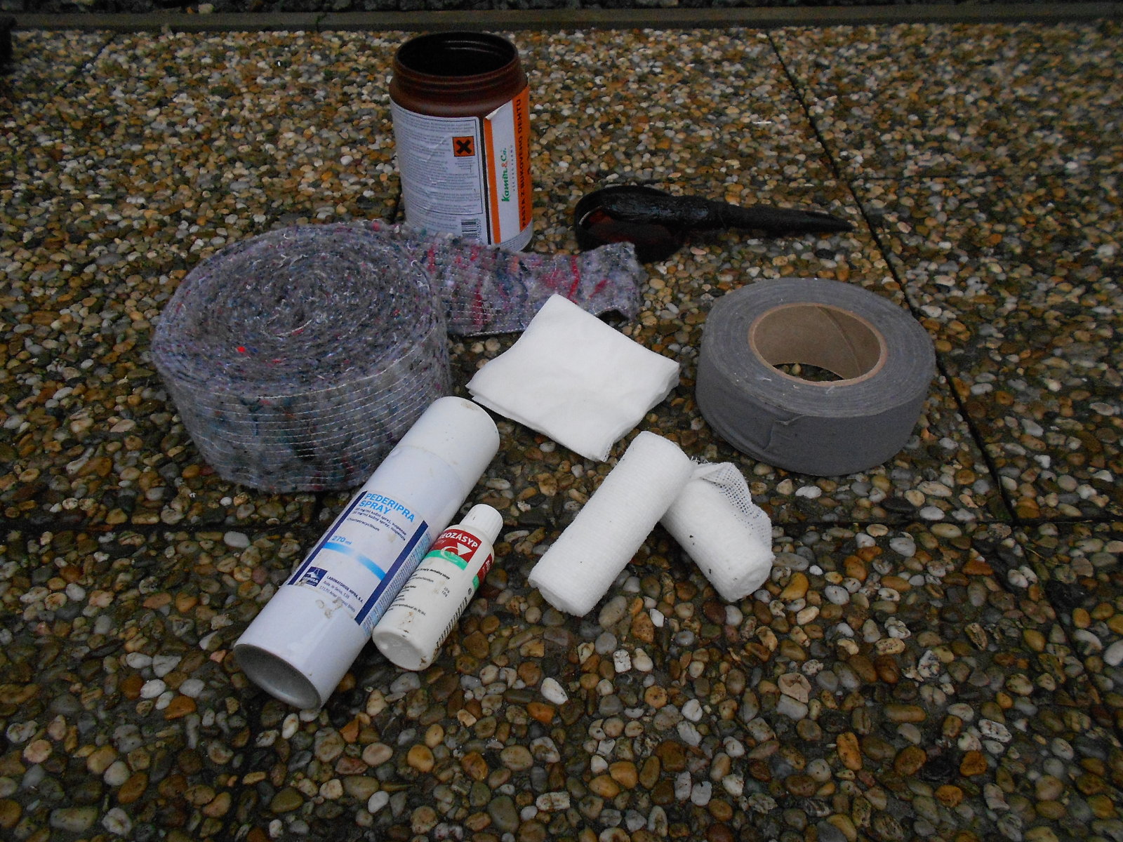 K ošetření bez obvazu používáme antibiotické spreje bez ochranných lhůt a sprej Antrolan‑N jako tekutý obvaz pokud je to nutné. V případě, že je třeba postižení paznehtu krýt obvazem používáme antibiotický zásyp nebo antibiotický sprej, který kryjeme elastickým obvazem překrytým textilní páskou a bukovým dehtem, tak aby nedošlo k prosáknutí vlhkosti do rány. Samozřejmostí je použití filcového podkladového materiálu aby nedocházelo k otlakům kolem obvazu (potřeby jsou na obr. 1). K chemickému podkování používáme lepidla BOVI-BOND a dřevěné podkůvky velikosti 112 mm a 130 mm (obr. 2).